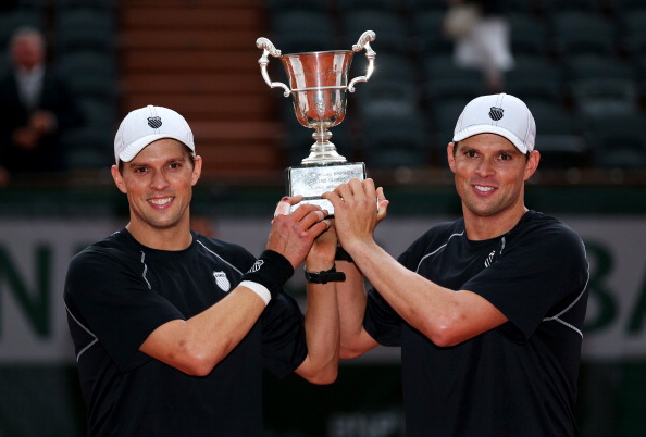 PARIS, FRANCE – JUNE 08: Bob Bryan and Mike Bryan of United States of America pose with the trophy after victory in the mens’ doubles final against Michael Llorda and Nicolas Mahut of France
