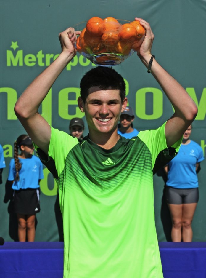 Lori Riffice was on hand to support Sam throughout his back-to-back wins at Eddie Herr and the Orange Bowl. “On the three-hour drive [between the tournaments] I made him do schoolwork on his laptop,” she notes. The transition from Eddie Herr’s hard courts to the Orange Bowl’s clay required some problem-solving. “Sam’s first-round opponent at the Orange Bowl was a young man from Mexico that he’d played at Eddie Herr,” says Lori. “He’d beaten him 1 and 0 at Eddie Herr, but at the Orange Bowl, he dropped the first set 6-0.”