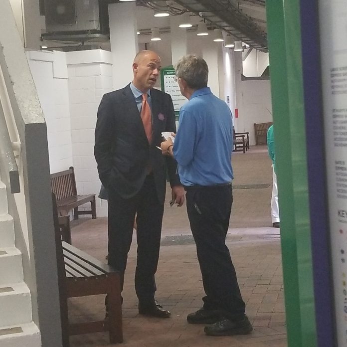 I wanted to interview Donald Trump again, as I had in 2004. Our President passed on coming to the All-England Tennis Club, but I got wind that his prime foe, Michael Avenatti, would be attending. I looked for him Friday, but Martina Navratilova told me that he wasn’t here – he’d be coming today. I caught up with the controversial attorney in the walkway under Centre Court during the Djokovic-Nadal semi.