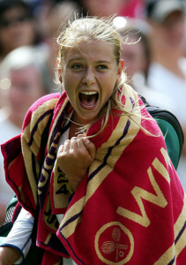 Encouraged by Martina Navratilova, Papa Yuri came to America to seek his family’s fortune through his slim kid. He washed dishes and pedaled with her on his bicycle to Florida tennis lessons. Then, he took her to Southern California where the Dutch drill-meister Robert Lansdorp perfected her punishing groundstrokes. Flat and fast – they were as good or better than those of Jennifer Capriati or Lindsay Davenport. Okay, her movement was suspect. Her serve was a riddle she never really solved. Rarely comfortable at net, she famously admitted that when she played on clay she was like “a cow on ice.” Simon Barnes asserted that with Maria, “There is a strange kind of awkwardness about her. She’s a rare mixture of grace and clumsiness, like a young horse that forgets how to count up to four in legs.”