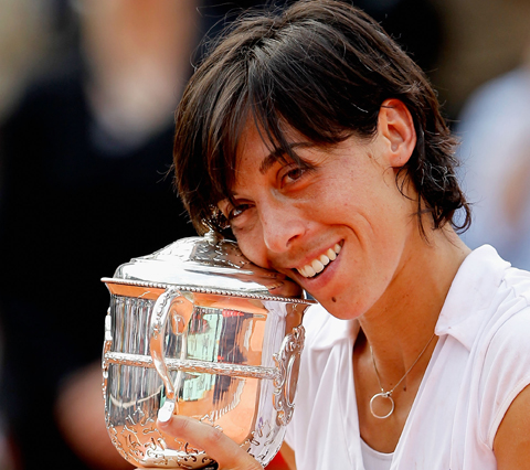 PARIS – JUNE 05: Francesca Schiavone of Italy celebrates with the trophy after winning the women’s singles final match between Francesca Schiavone of Italy and Samantha Stosur of Australia on day fourteen of the French Open at Roland Garros on June 5, 2010 in Paris, France. (Photo by Matthew Stockman/Getty Images) *** Local Caption *** Francesca Schiavone