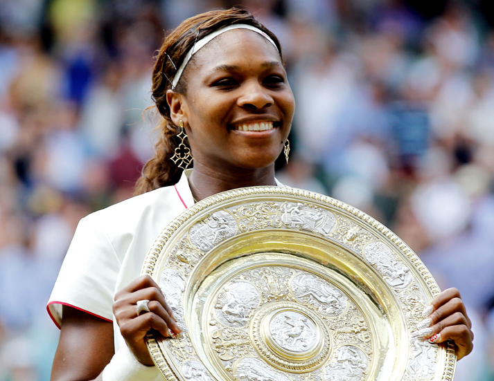 LONDON, ENGLAND – JULY 03: Serena Williams of USA lifts the Championship trophy after winning her Ladies Singles Final Match against Vera Zvonareva of Russia on Day Twelve of the Wimbledon Lawn Tennis Championships at the All England Lawn Tennis and Croquet Club on July 3, 2010 in London, England. (Photo by Matthew Stockman/Getty Images) *** Local Caption *** Serena Williams