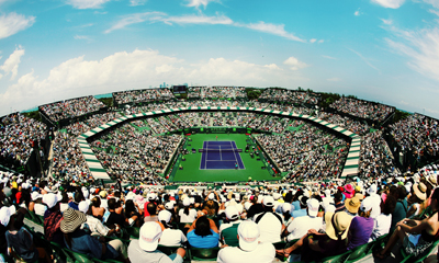 MIAMI AND KEY BISCAYNE, FLORIDA, APRIL 1, 2012, SONY-ERICSSON OPEN FINAL, AGNES RADWANSKA, POLAND, DEFEATED MARIA SHARAPOVA, RUSSIA. VIEW OF CENTER COURT, BISCAYNE BAY AND MIAMI FROM SOUTH TO NORTH.