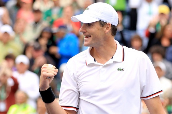 INDIAN WELLS, CA – MARCH 17: John Isner celebrates his win over Novak Djokovic of Serbia during the semifinals of the BNP Paribas Open at the Indian Wells Tennis Garden on March 17, 2012 in Indian Wells, California. (Photo by Matthew Stockman/Getty Images)