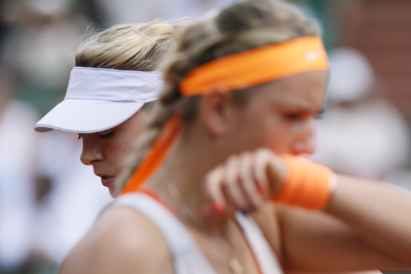Russia’s Maria Sharapova (L) and Belarus’ Victoria Azarenka change sides during their French tennis Open semi final match at the Roland Garros stadium in Paris on June 6, 2013. AFP PHOTO / PATRICK KOVARIK (Photo credit should read PATRICK KOVARIK/AFP/Getty Images)