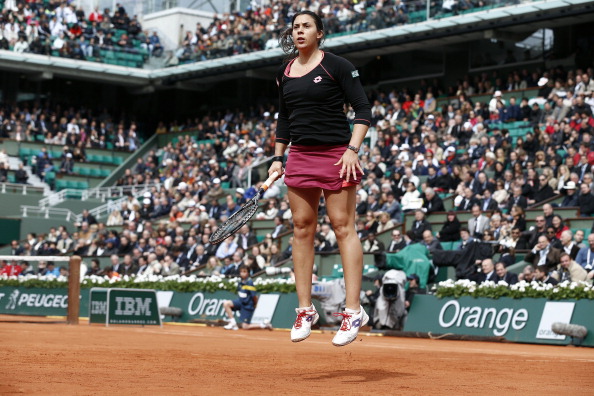 France’s Marion Bartoli warms up during a French tennis Open first round match against Belarus’ Olga Govortsova at the Roland Garros stadium in Paris on May 28, 2013. AFP PHOTO / THOMAS COEX (Photo credit should read THOMAS COEX/AFP/Getty Images)