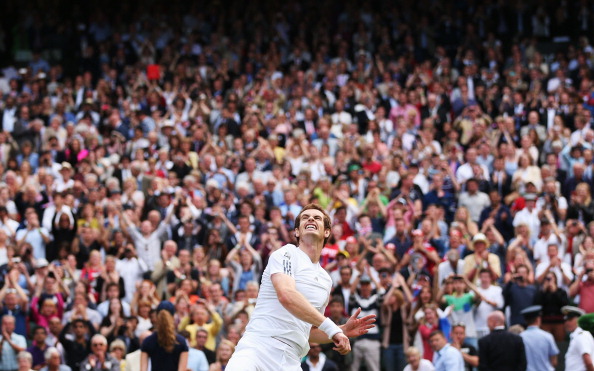 LONDON, ENGLAND – JULY 03: Andy Murray of Great Britain throws his wristband into the crowd as he celebrates match point during the Gentlemen’s Singles quarter-final match against Fernando Verdasco of Spain on day nine of the Wimbledon Lawn Tennis Championships at the All England Lawn Tennis and Croquet Club at Wimbledon on July 3, 2013 in London, England. (Photo by Clive Brunskill/Getty Images)